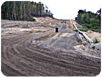 Nach 200 Metern öffnet sich ein Einschnitt einen Hügel hinauf. Der Wald ist abgeholzt, der sandige Boden durchwühlt. Wir nutzten die Schneise als sehr breiten Fusßweg mit den Ausmaßen einer Autobahn. Das macht uns zwar traurig, aber solche Größenordnungen sind wir Münchner auch gewohnt. |