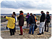 Am nächsten Morgen holt uns Ralf Röhr vom Lacoma e.V. ab. Er hat ein dichtes Programm mit hervorragenden Führern organisiert. Renaturierung und Tagebau stehen auf dem Programm. Mit dabei sind Herr Dr. Martin Gast, Leiter der Abteilung Gewässersanierung und Naturschutz im Forschungsinstitut für Bergbaufolgelandschaften e.V. und Herr Stefan Röhrscheid vom NABU, Leiter des Projektes „Naturparadies Grünhaus“ bei Finsterwalde. Der NABU hat das Gebiet im ehemaligen Tagebau Lauchhammer gekauft, damit die Natur eigenständig wieder wurzeln fassen darf. Renaturierung statt Rekultivierung ist im „Grünhaus“ das Motto. Das bedeutet, dass hier nicht nachträglich Bodenschichten aufgelegt werden oder Kulturpflanzen gezielt ausgesät werden. Hier darf die Natur wachsen, wie sie möchte, und das Gebiet langsam wieder zurück erobern. Natürlich werden die Prozesse beobachtet und wir können dank diesem NABU-Projekt viel lernen, was wir mit unseren Kippen und Kohlegruben in Zukunft machen können.